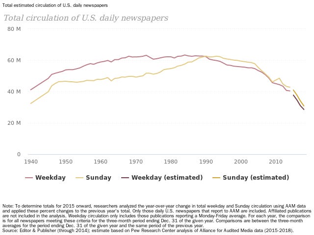 For most of the period since WW2, print periodical publishing was dominated by two sectors - daily newspapers and women’s magazines. This chart, taken from Pew Research Center’s Newspaper Fact Sheet, shows the problem :