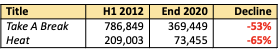 I don’t have a comparable graph for magazines but here’s some basic numbers that illustrate the point, comparing the circulation of two weekly women’s / entertainment titles in the UK from 2012 to today :